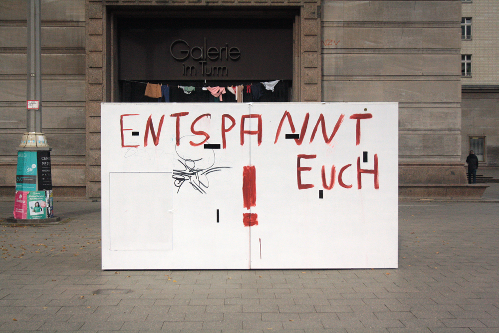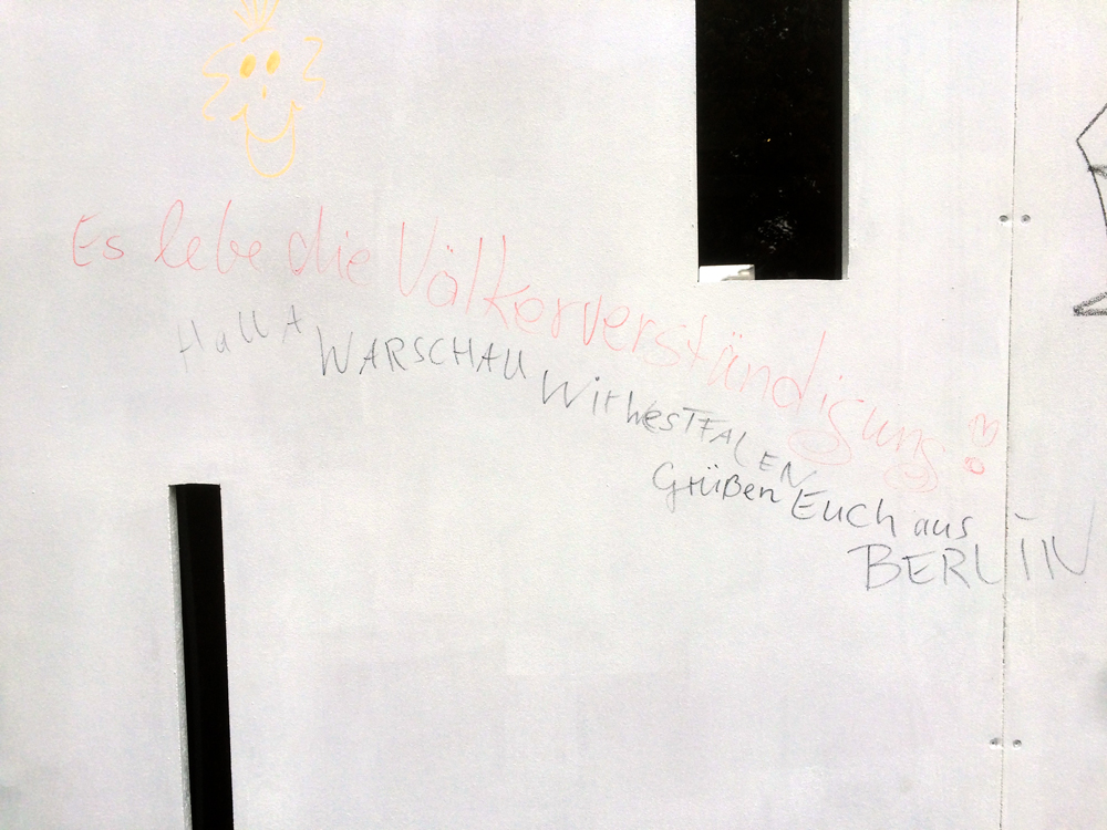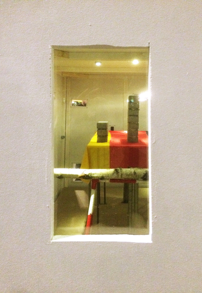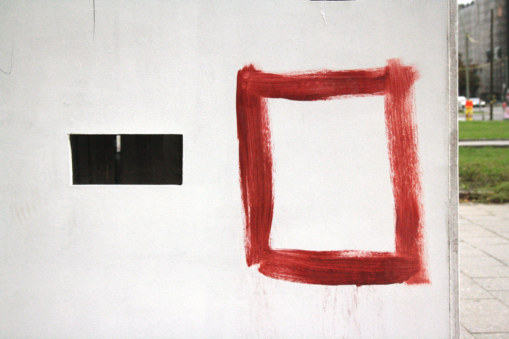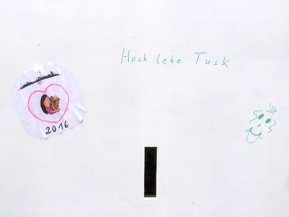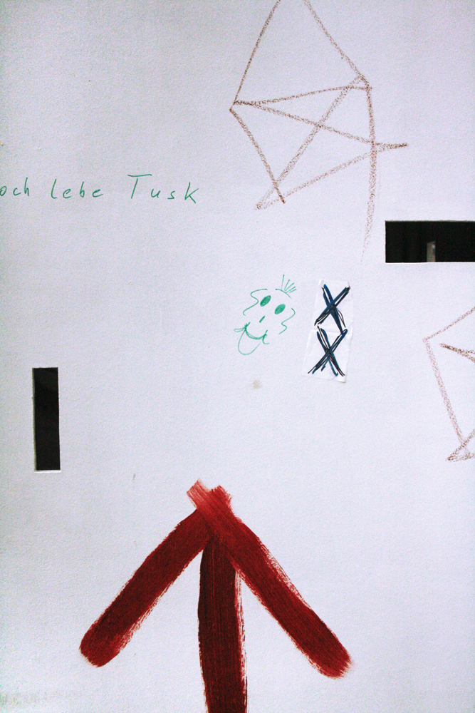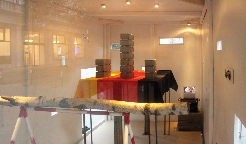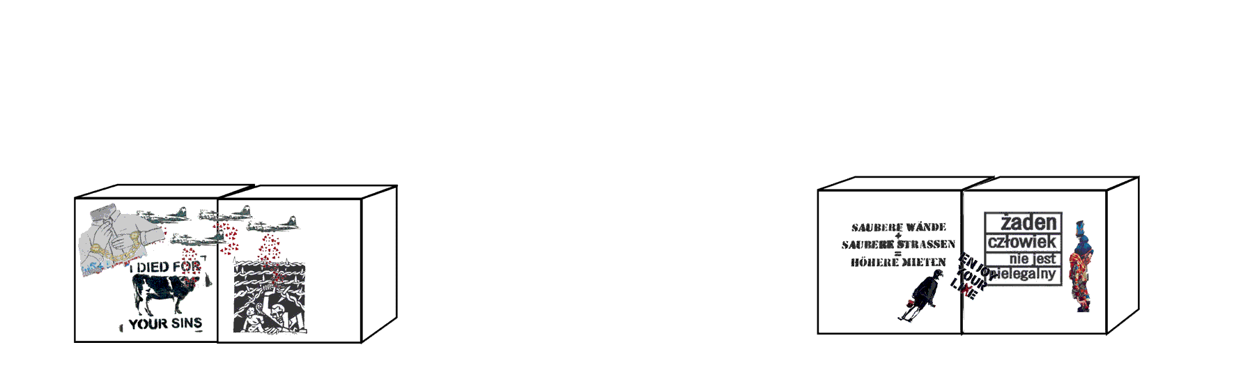 Der Schwerpunkt beider Boxen bildet das Thema Grenzen im nationalen Kontext, also nicht die deutsch-polnische Grenze an sich, sondern Grenzen, die meiner Auffassung nach in der deutschen und polnischen Gesellschaft existieren. Meine Arbeit über die deutsche Gesellschaft thematisiert eine Installation zur aktuellen Flüchtlingspolitik, die Deutschland derzeit polarisiert. Die Arbeit setzt sich aus der deutschen Flagge zusammen, die gespannt wurde und mehrmals mit der häufig verwendeten Aussage der Kanzlerin Angela Merkel „Wir schaffen das“, versehen wurde. Dieser Satz symbolisiert die aktuelle Politik der deutschen Regierung und teilt die politische Szene Deutschlands sowie ihre Gesellschaft. Bei der Arbeit über die polnische Gesellschaft handelt es sich um eine Installation, die in einer rohen Ästhetik des „minimal art“ gehalten wird und die Replik einer Barriere, Sperre oder Grenzwand darstellt (aus rot-weiß bemaltem Stahl). Jedoch soll diese nicht als Grenze zwischen zwei