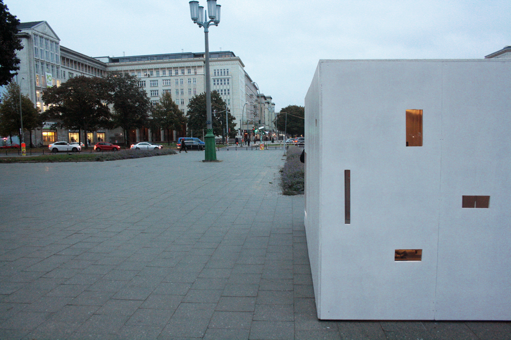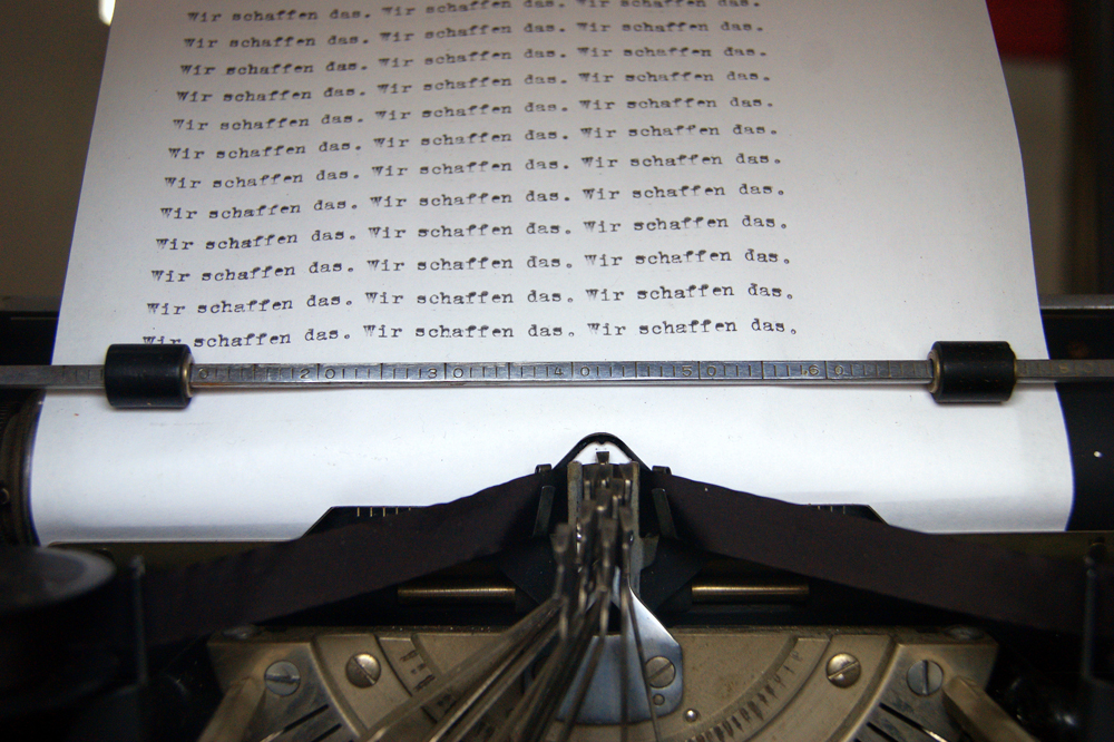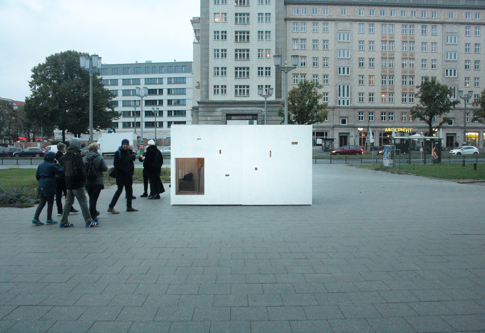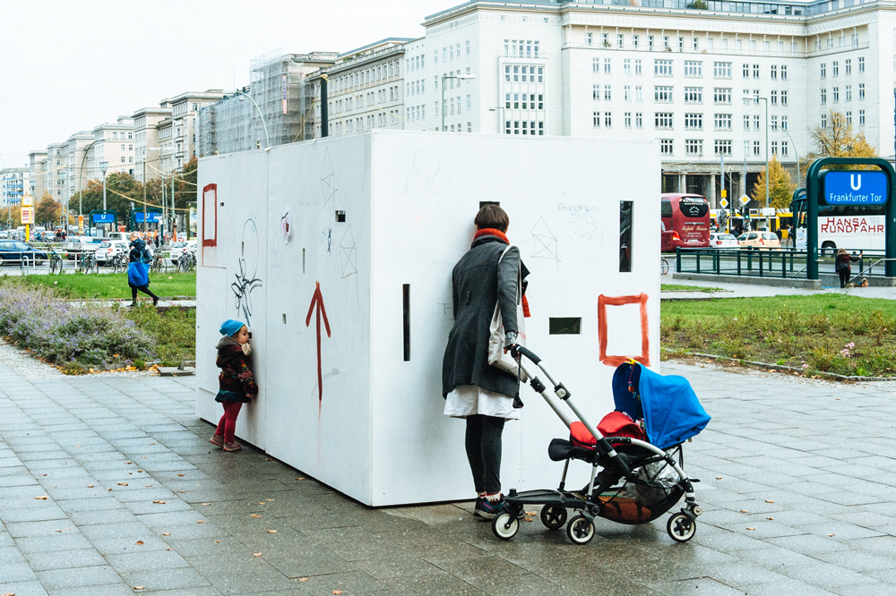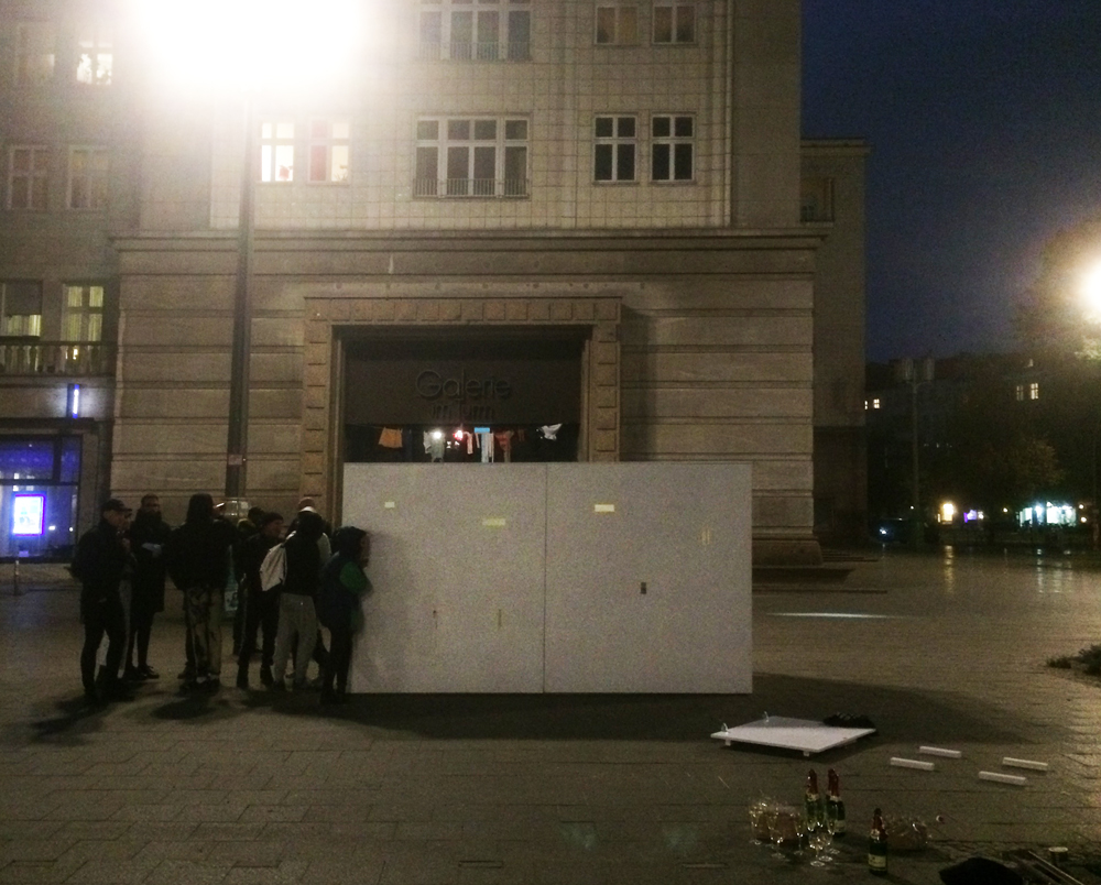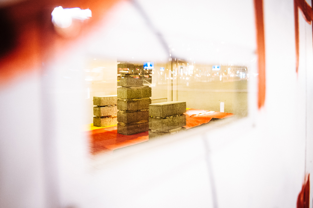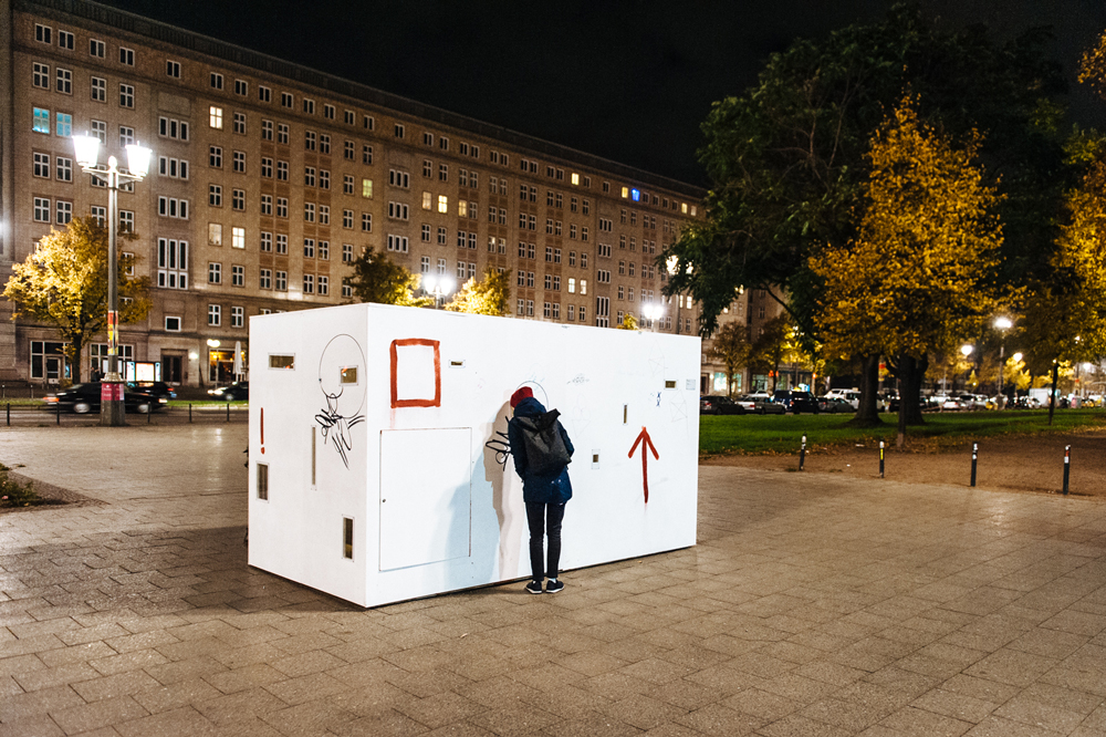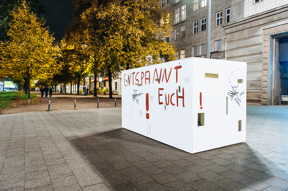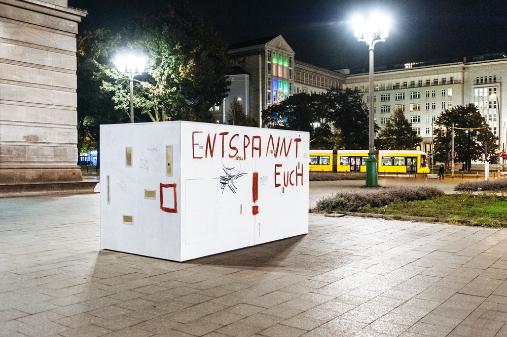 Der Schwerpunkt beider Boxen bildet das Thema Grenzen im nationalen Kontext, also nicht die deutsch-polnische Grenze an sich, sondern Grenzen, die meiner Auffassung nach in der deutschen und polnischen Gesellschaft existieren. Meine Arbeit über die deutsche Gesellschaft thematisiert eine Installation zur aktuellen Flüchtlingspolitik, die Deutschland derzeit polarisiert. Die Arbeit setzt sich aus der deutschen Flagge zusammen, die gespannt wurde und mehrmals mit der häufig verwendeten Aussage der Kanzlerin Angela Merkel „Wir schaffen das“, versehen wurde. Dieser Satz symbolisiert die aktuelle Politik der deutschen Regierung und teilt die politische Szene Deutschlands sowie ihre Gesellschaft. Bei der Arbeit über die polnische Gesellschaft handelt es sich um eine Installation, die in einer rohen Ästhetik des „minimal art“ gehalten wird und die Replik einer Barriere, Sperre oder Grenzwand darstellt (aus rot-weiß bemaltem Stahl). Jedoch soll diese nicht als Grenze zwischen zwei